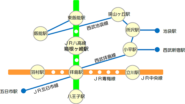 - JR八高線「箱根ヶ崎駅東口」→タクシーで約5分(徒歩の場合は25分)
